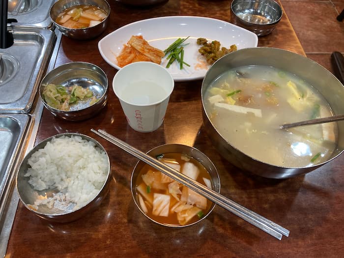 それが今回は不思議なことに、スープが濃厚でコクがあって美味しいと感じました。歳のせいでしょうか?? 全部美味しくいただきました。特にアミの塩辛が美味しかった! 胡麻油とネギとの和え物のようで、ご飯に載せて食べると絶品でした。